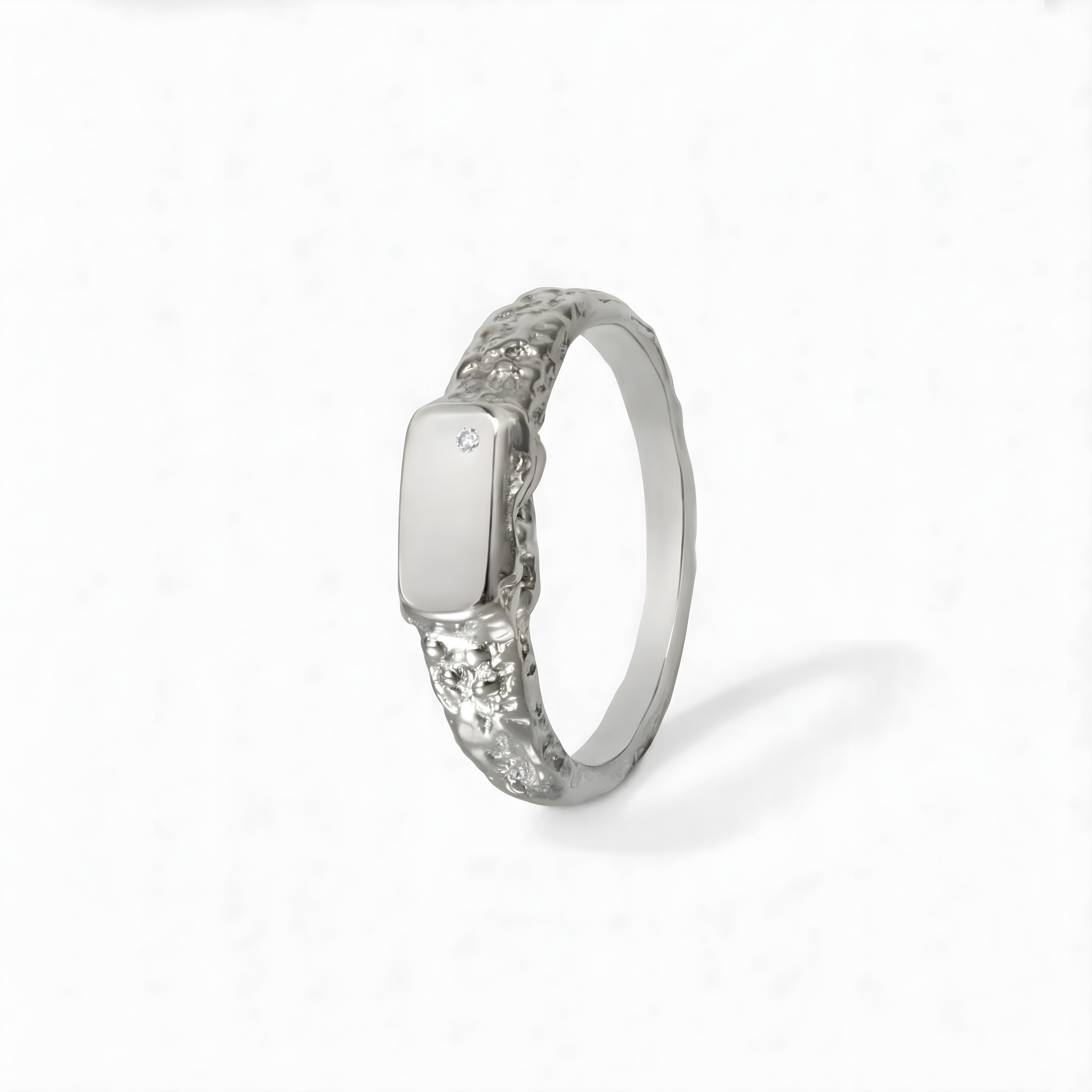 Its textured, handcrafted band encircles a smooth, delicate setting, accented with a white or black diamond sparkle, depending on your preference.