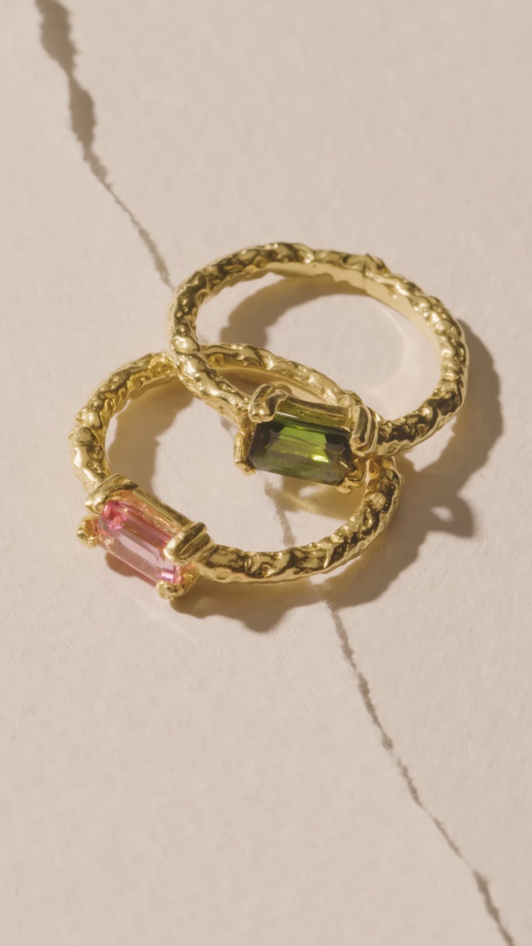 With a raw, textured effect, the slim band of the Marius ring is handcrafted by our jewelers. A pink or green tourmaline is delicately set into it. With its subtle color variations, each stone is unique. The Marius ring is available in Silver Gold Vermeil.
