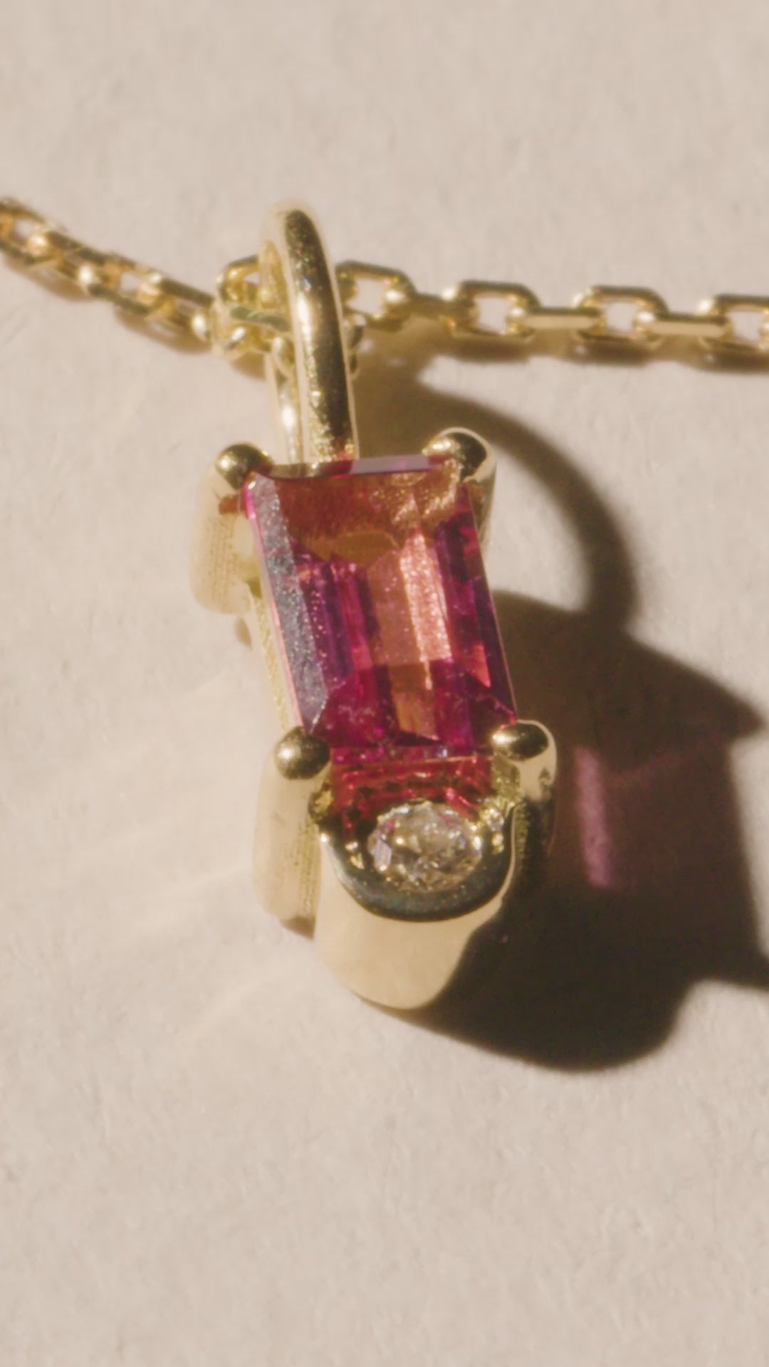The Doress necklace is a bit like the pendant we would have loved to inherit from our grandmother, with its central stone: pink or green tourmaline, citrine or garnet, worked into a retro shape shouldered by a white diamond. Fashioned in 18-carat gold, we let you choose the color to make it even more unique: yellow gold, rose gold or white gold.