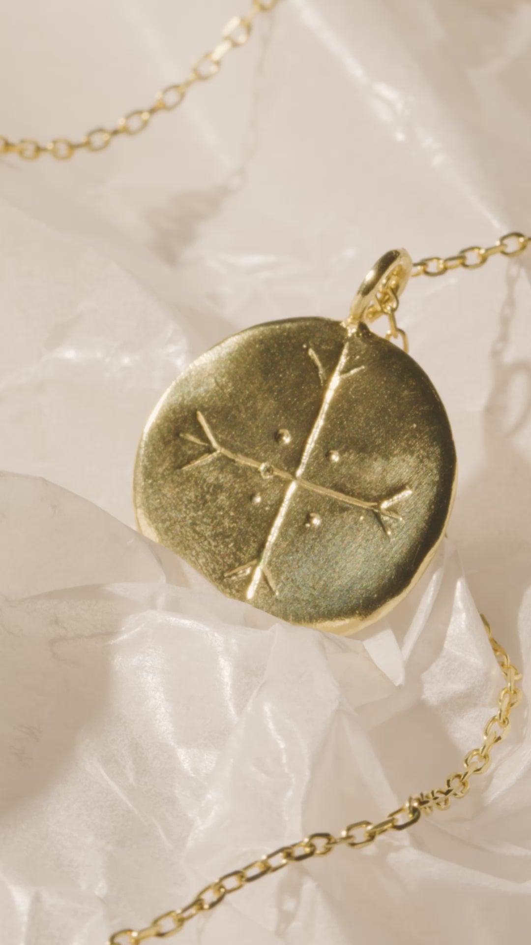 The Mya necklace, with a medallion engraved by our jewelers, is available in Silver Gold Vermeil. Inspired by Berber culture, the + sign symbolizes the eye of God, the star whose light guides man through the night. A ruby has been delicately set on the back of the medallion. The Mya necklace can be worn with either the symbol or the ruby facing outwards and can be personalized with an engraving.