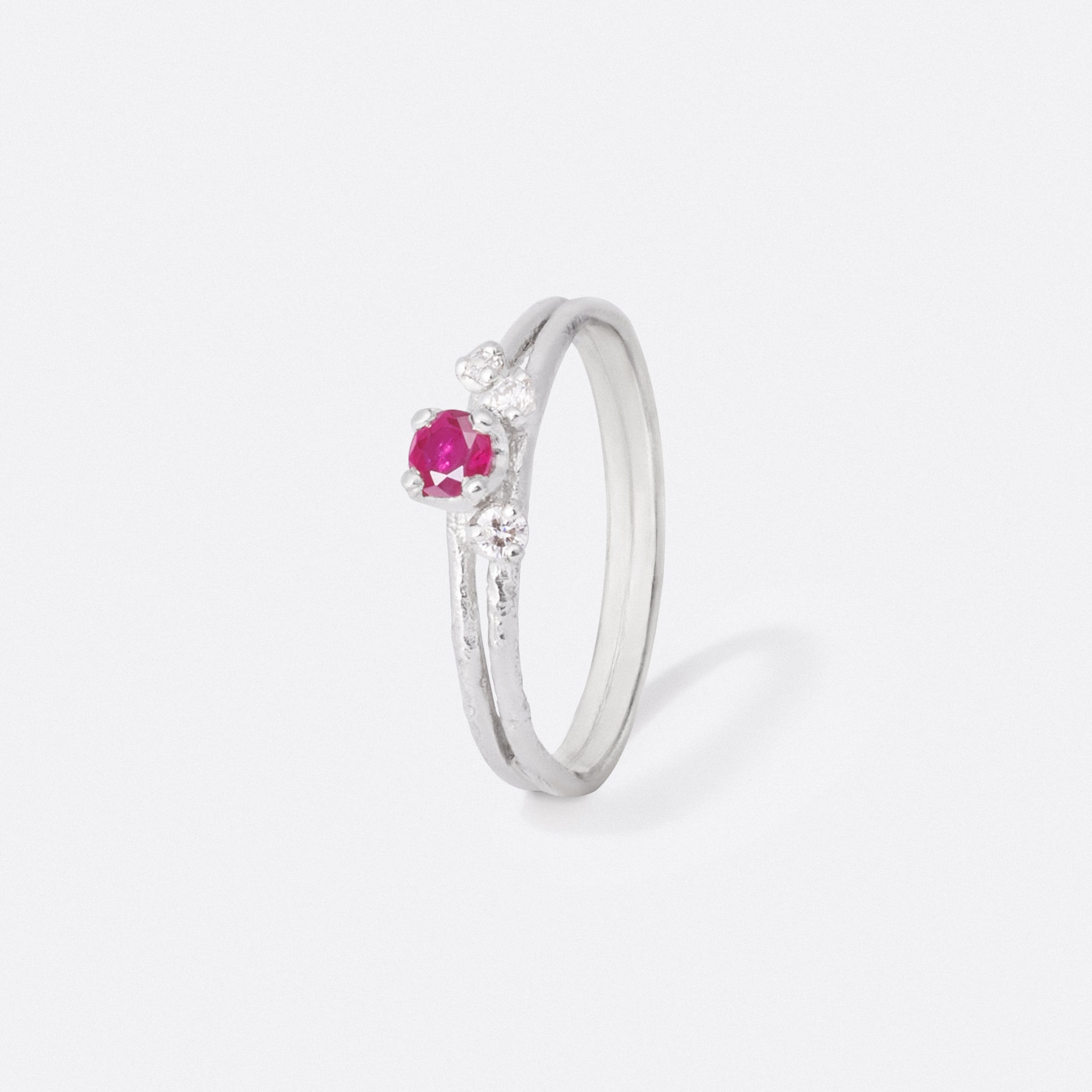 DIANA, une bague sculpturale et lumineuse, où une pierre centrale, diamant de synthèse, rubis, émeraude ou saphir, est délicatement entourée de trois diamants de synthèse étincelants.
