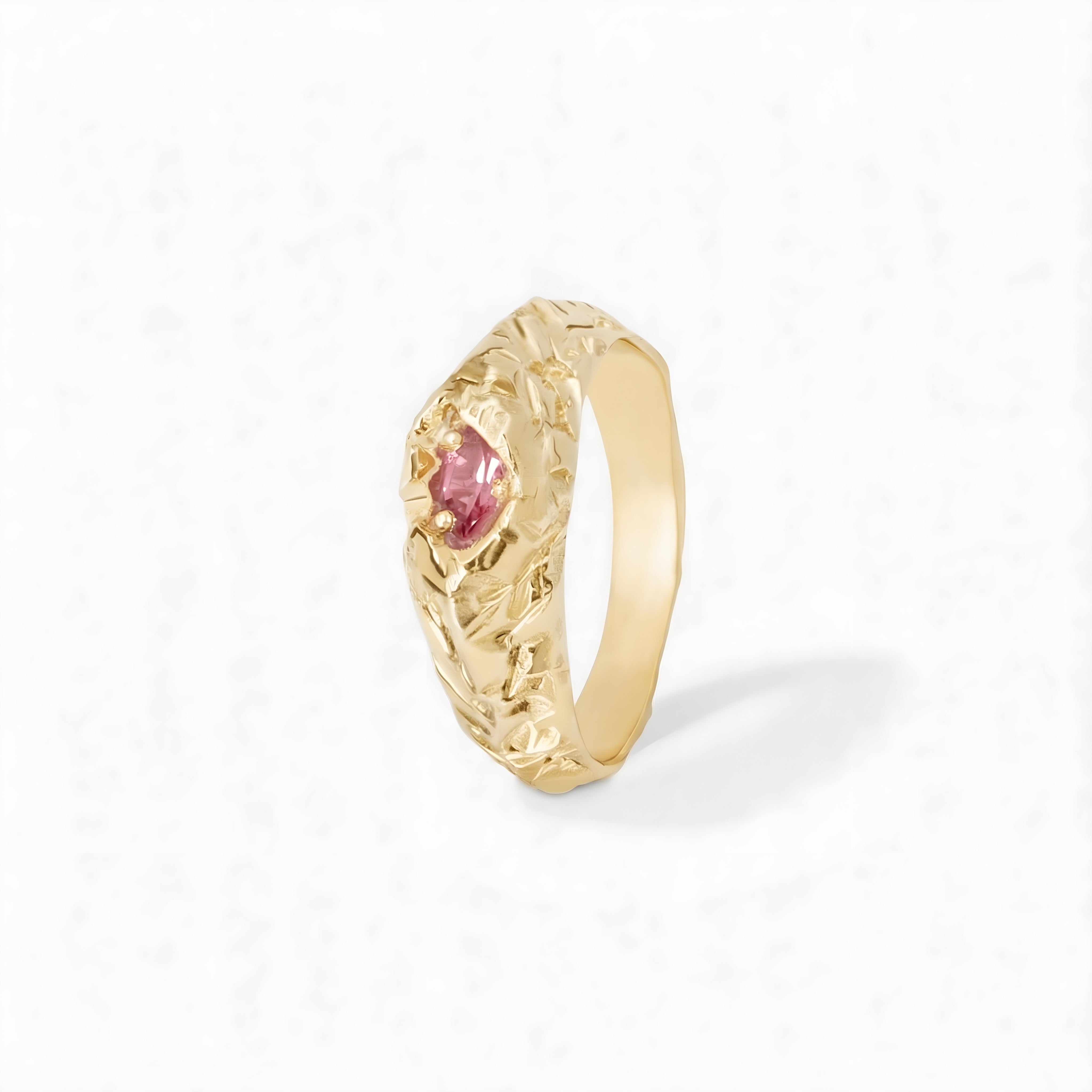 La bague Zia, en argent ou en vermeil, accueille une tourmaline rose ou verte comme enfouie dans la matière.