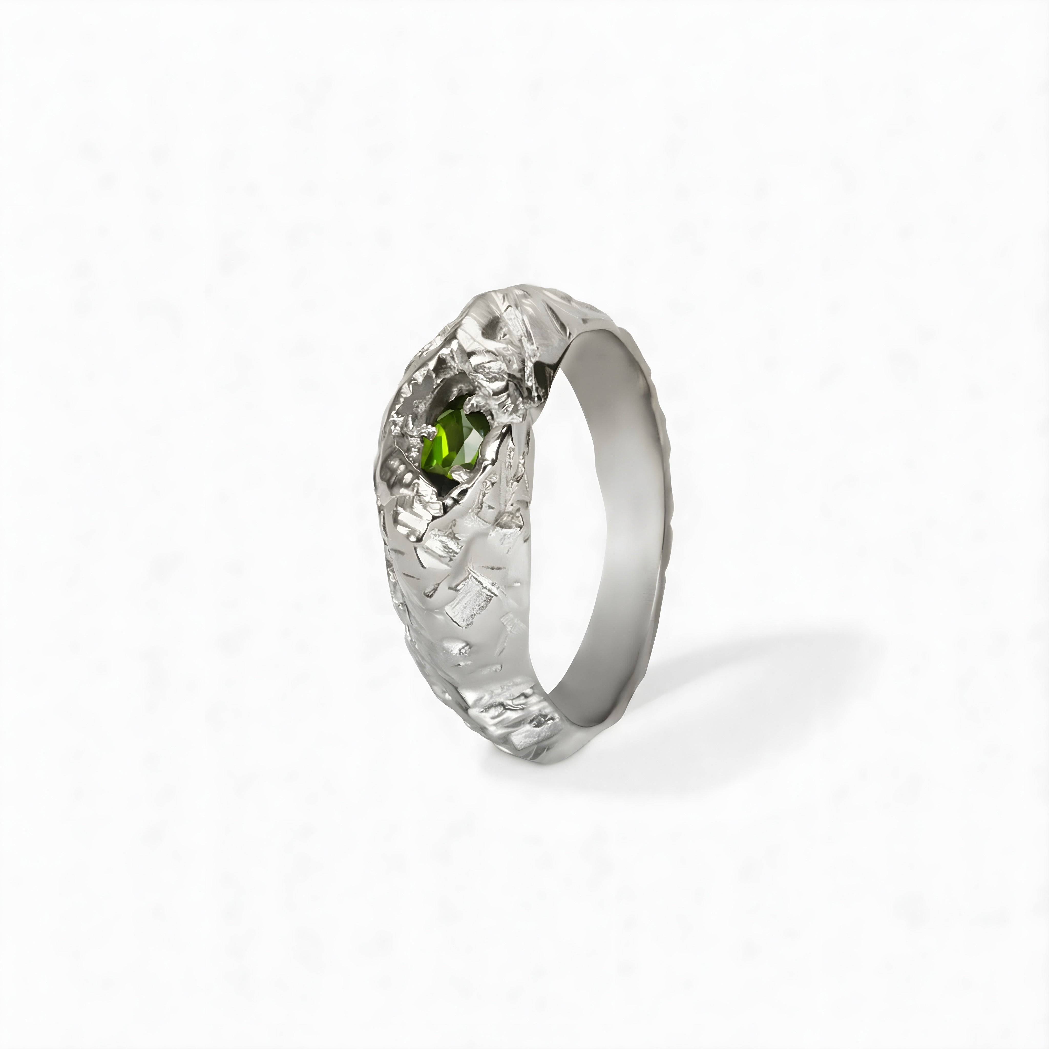 Son métal sculpté, organique et rocheux, lui donne l’allure d’une pépite précieuse révélée par la nature.
