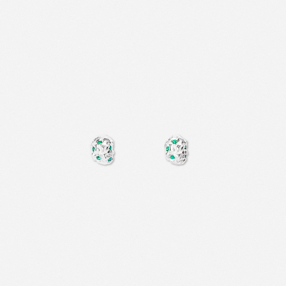 Subtiles et précieuses, les puces IVY évoquent de petites pépites minérales serties de lumière. Leur forme organique, délicatement sculptée dans le métal, accueille de fines émeraudes et saphirs, dont les éclats verts et bleus se répondent avec poésie.